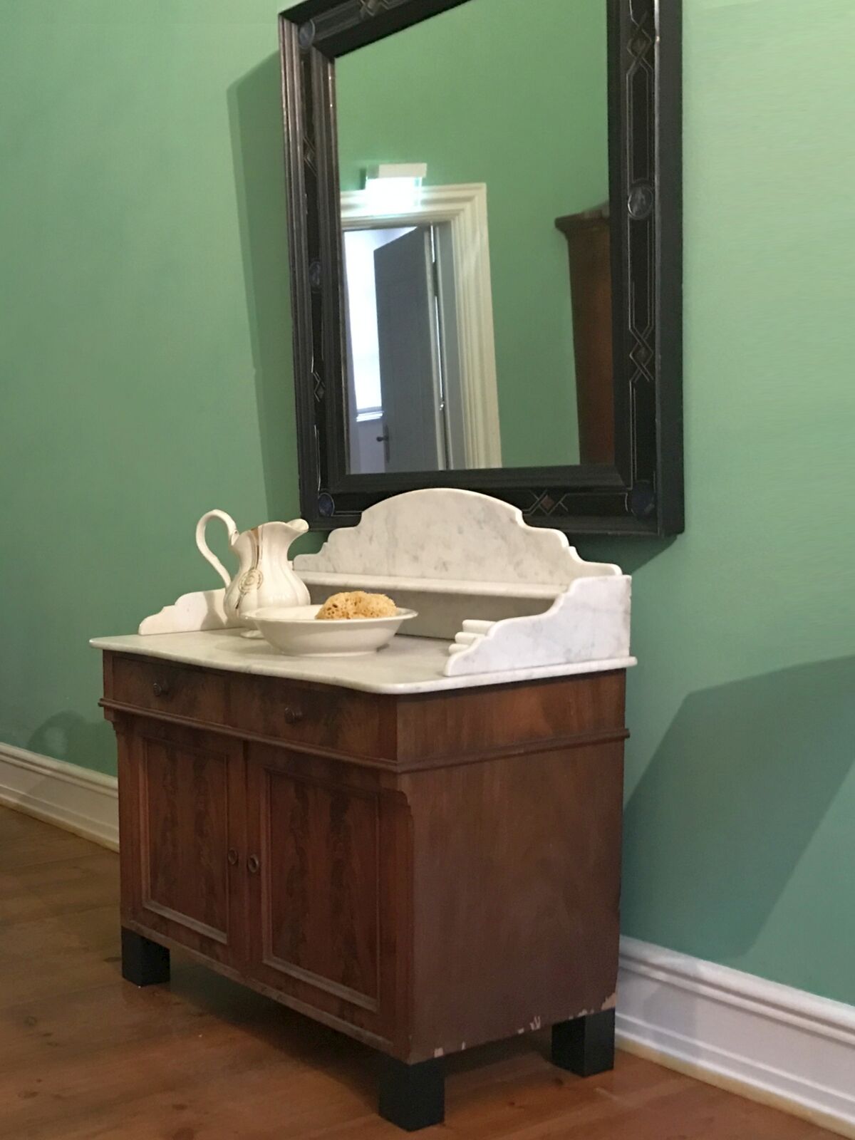 Wir freuen uns, dass der Freundeskreis Schloss Eutin bei der Finanzierung der Objekte das Schloss wieder tatkräftig unterstützt hat. Der Bidetstuhl wurde bereits 2022 und die Waschkomode 2025 für die Vervollständigung der Mobilarsammlung erworben. Das neu gestaltete Badezimmer ist seit September 2025 zu bewundern.