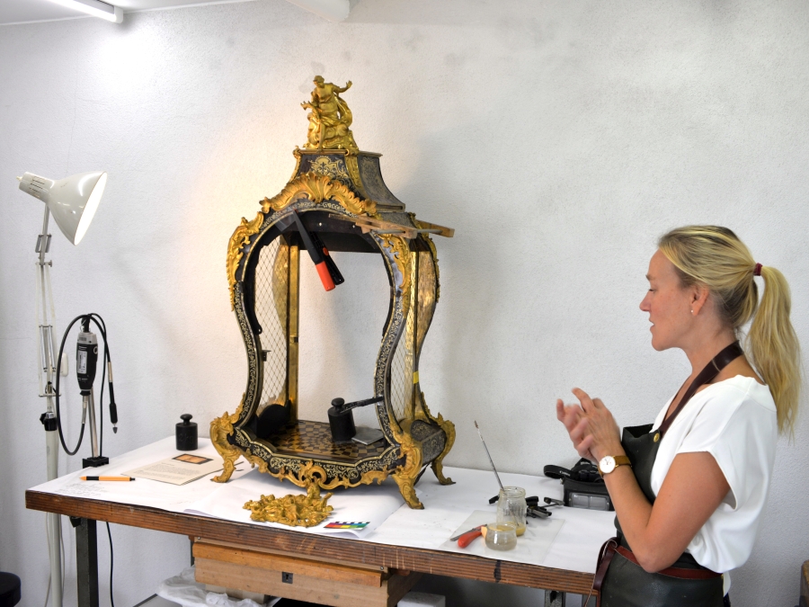 Die Bezeichnung „Boulle-Uhr“ geht zurück auf den berühmten Kunsttischler André Charles Boules (1642-1732), der überwiegend für den französischen Hof arbeitete und die Technik der Einlegearbeiten an Möbeln, Uhren und Fußböden vervollkommnete. Er beeinflusste ganz Europa. Die reich mit Ranken und Figuren geschmückte Uhr war unter anderem auch mit Schildpatt (aus dem Panzer von Schildkröten) gefertigt. Bei der Restaurierung, die der Freundeskreis förderte, wurde nach heutigem Standard ein Ersatzmaterial verwendet. Die restaurierte Uhr steht seit 2020 auf einem Konsolentisch im Europazimmer.